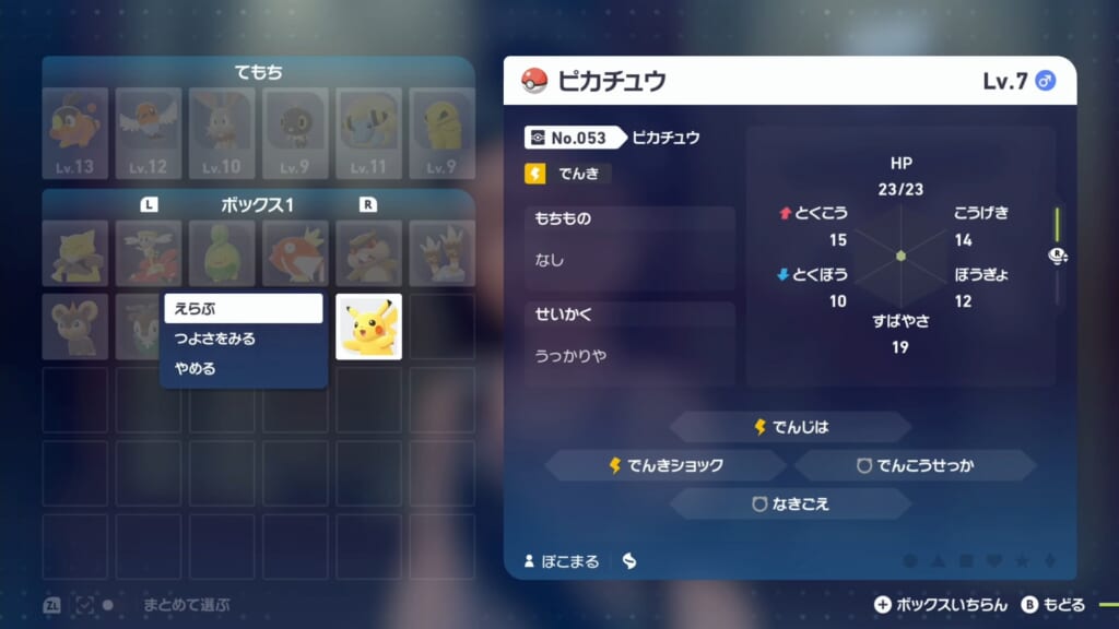 エシャンのところに戻り再び話しかけ、捕獲したピカチュウを渡します。