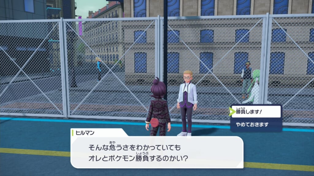 ヒルマンに話しかけ「勝負します!」を選択するとバトルを行えます。