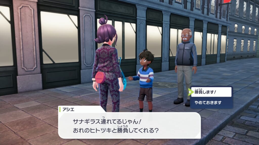 アシエに話しかけ「勝負します!」を選択するとバトルを行えます。