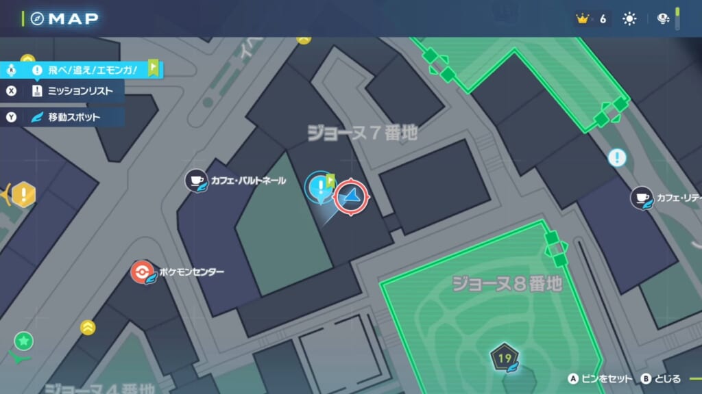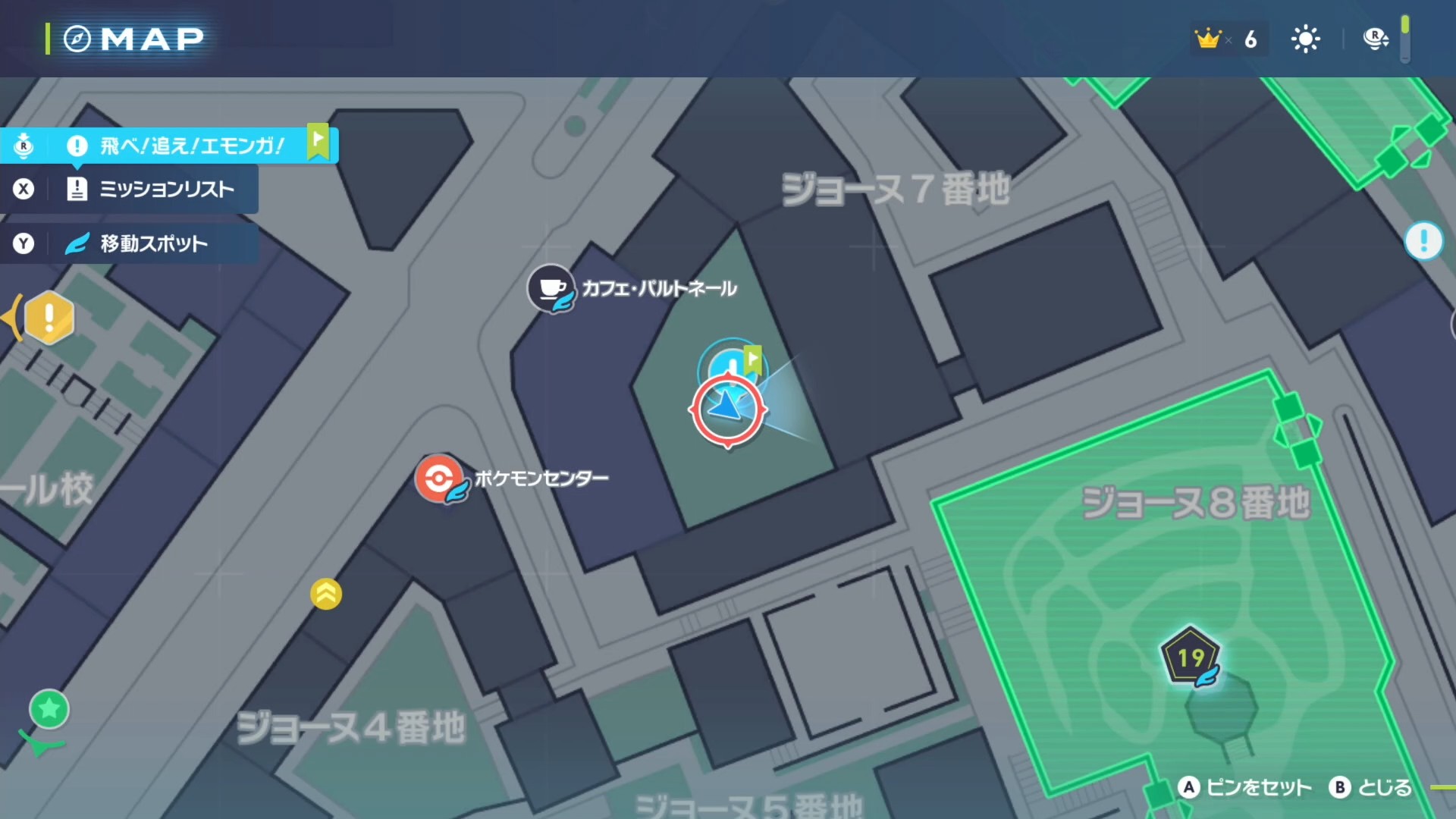 マップからサイドミッションを選択し「飛べ!追え!エモンガ!」を選択するとエモンガの地点が表示されるようになります。