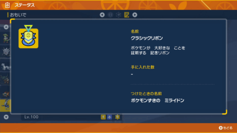 特別なリボン「クラシックリボン」がついており、つけると「ポケモンずきの ミライドン」(コライドン)と表示されます。