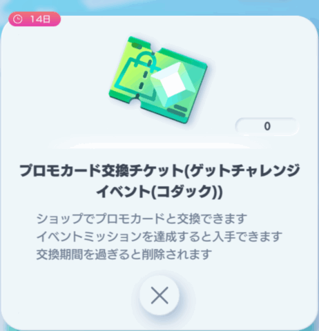今回のゲットチャレンジイベントから「プロモカード交換チケット」が入手できるようになりました。1枚だけ入手でき、好きなプロモカードとの交換が行えます。