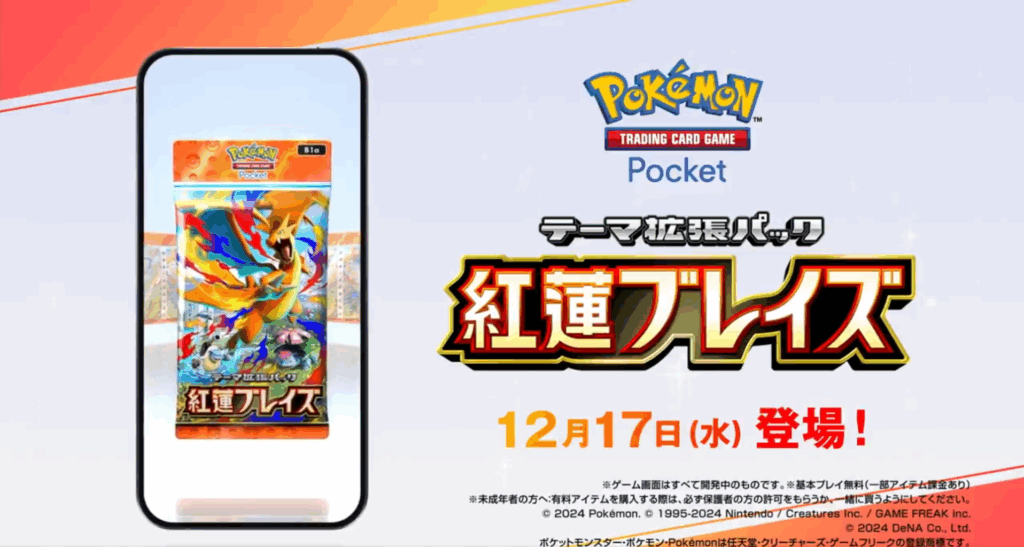 ポケカアプリ『ポケポケ(ポケモンTCGポケット)』で新たなテーマ拡張パック「紅蓮ブレイズ」のカード情報が12月11日に発表されました。