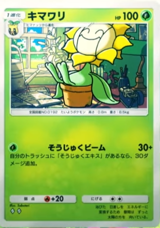 自分の場の草ポケモンを1匹選び、そのポケモンから進化する草ポケモンを、自分の山札から1枚、そのポケモンに乗せて進化させる。 (最初の自分の番や、出したばかりのポケモンには使えない。) |