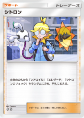 自分の山札から「レアコイル」「エレザード」「シトロンのリュック」をランダムに2枚、手札に加える。 |