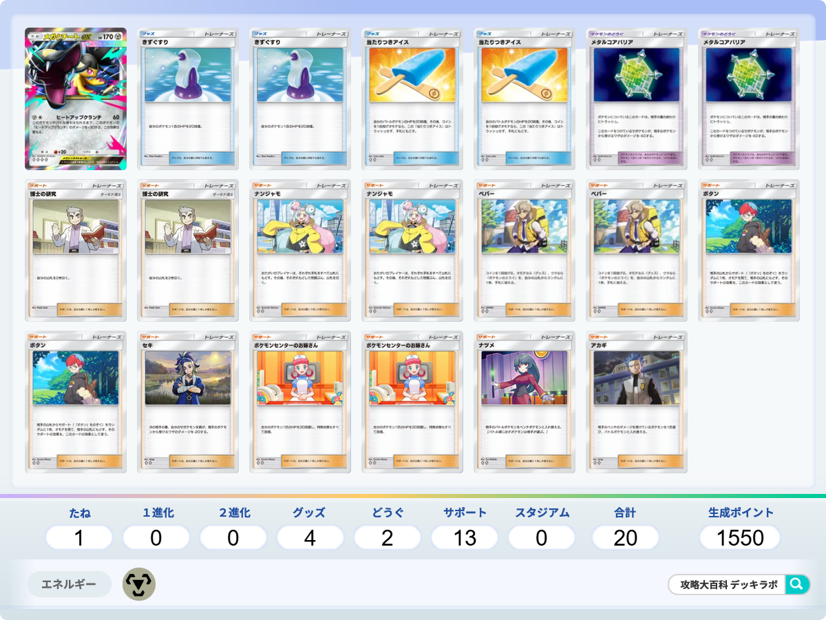 ・メタルコアバリアや当たりつきアイスで耐久しつつ、メガクチートexの連続攻撃で勝利を目指すデッキです。