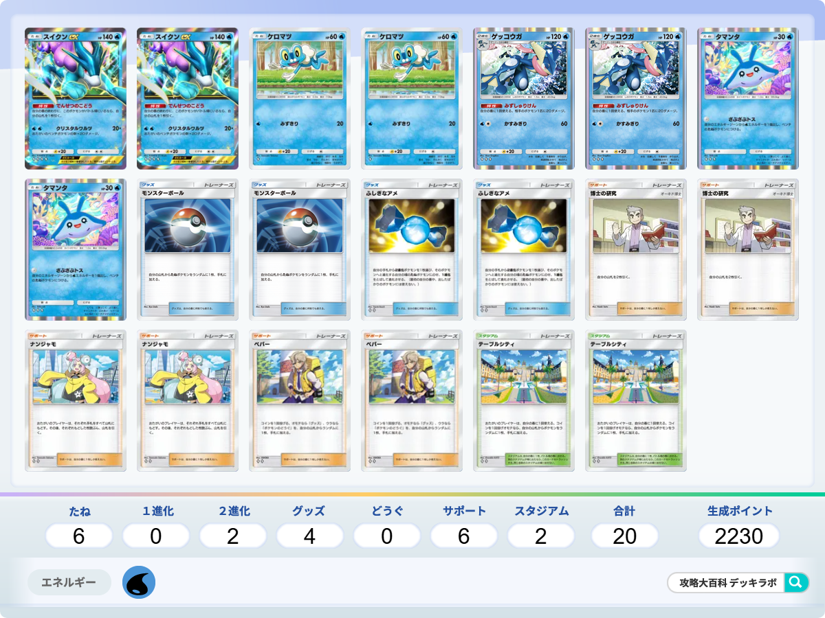 ・タマンタでスイクンexにエネルギー加速しつつ、ベンチにポケモンを並べて早めに決着をつけるデッキです。