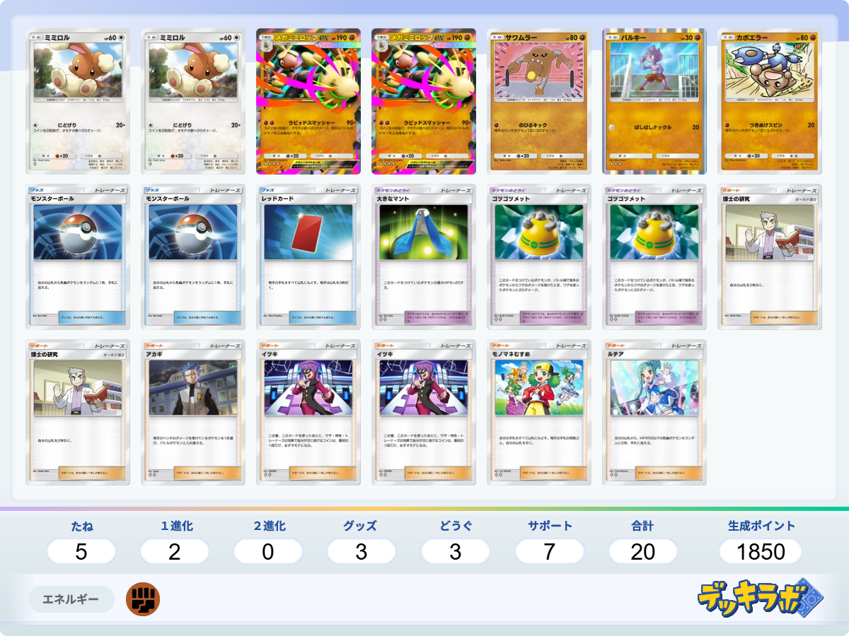 ・ワザ「メガブラスター」は4エネルギーと重いが、相手のデッキの上3枚をトラッシュに送れるため、早めに展開できればプランを崩しやすい