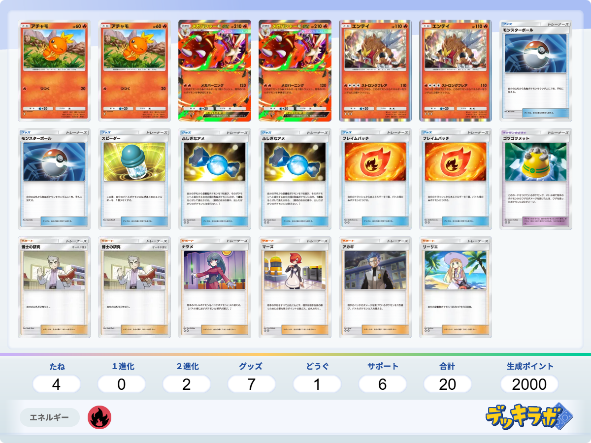 ・サブポケモンはドロー加速ができるエンテイex、30ダメージのベンチ狙撃ができるクイタラン(メガライジング)、序盤の耐久力に優れるトリミアン(紅蓮ブレイズ)などから選ぶ