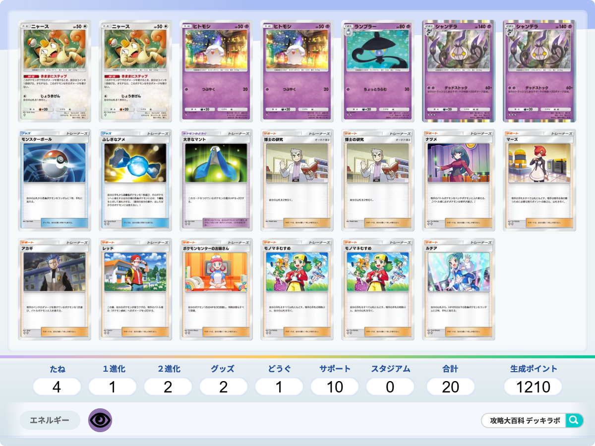 Tier2 ・HP140の非ex主軸デッキで1-1-1進行が安定する ・トラッシュにあるサポートカードに応じてシャンデラのダメージが上がる ・序盤はニャース(夢幻パレード)で耐えつつドロー加速する ・サブアタッカーとして手札を捨ててダメージを出せるパンプジン(夢幻パレード)、ヤミラミ(メガライジング)、デスカーン(メガライジング)など、幅広いポケモンを採用可能 |