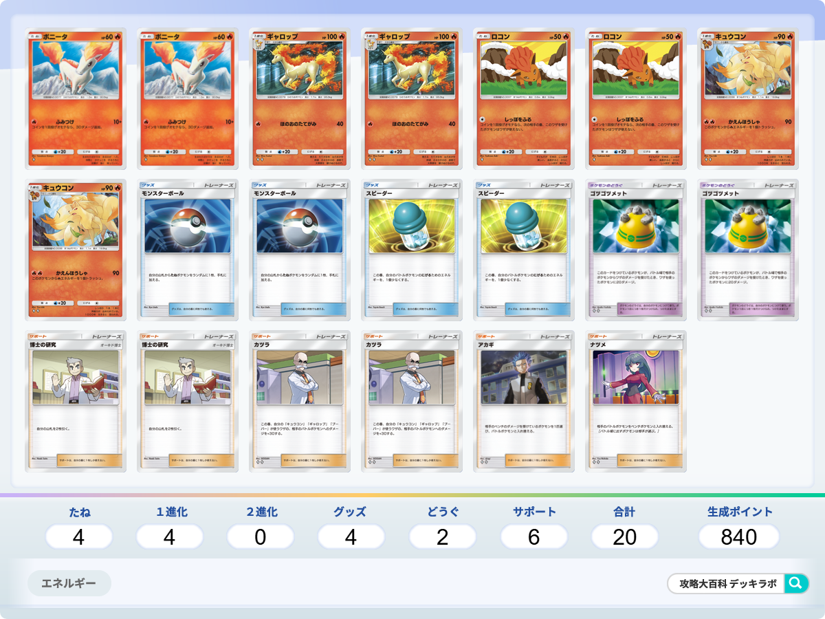 ・基本的には先行ならギャロップ、後攻ならキュウコンで2ターン目からダメージを出していくデッキです。