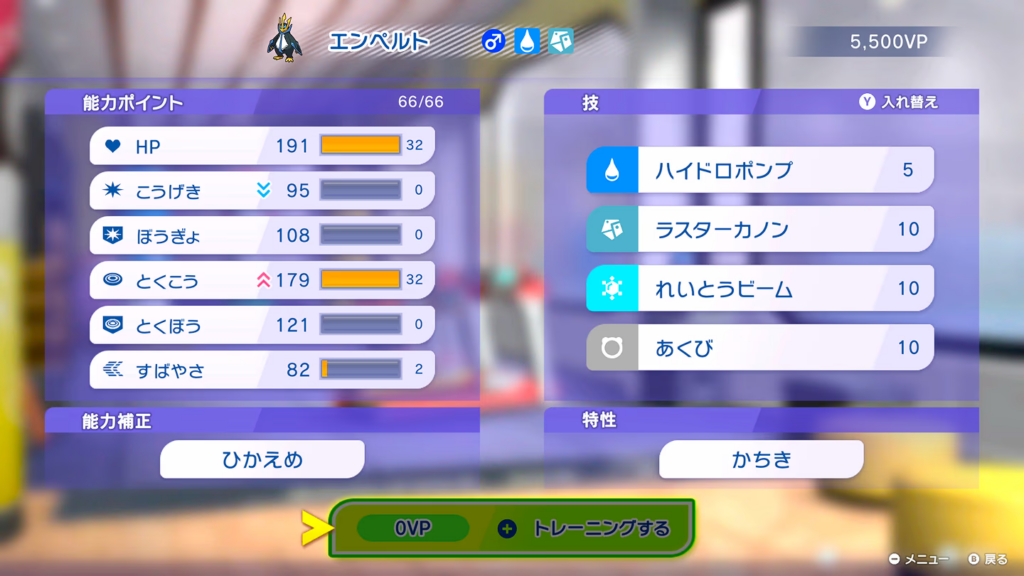 ポケモンの「こうげき」や「ぼうぎょ」といった各ステータスにポイントを割り振ることができます。