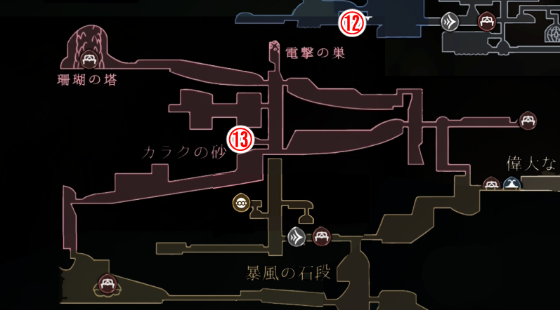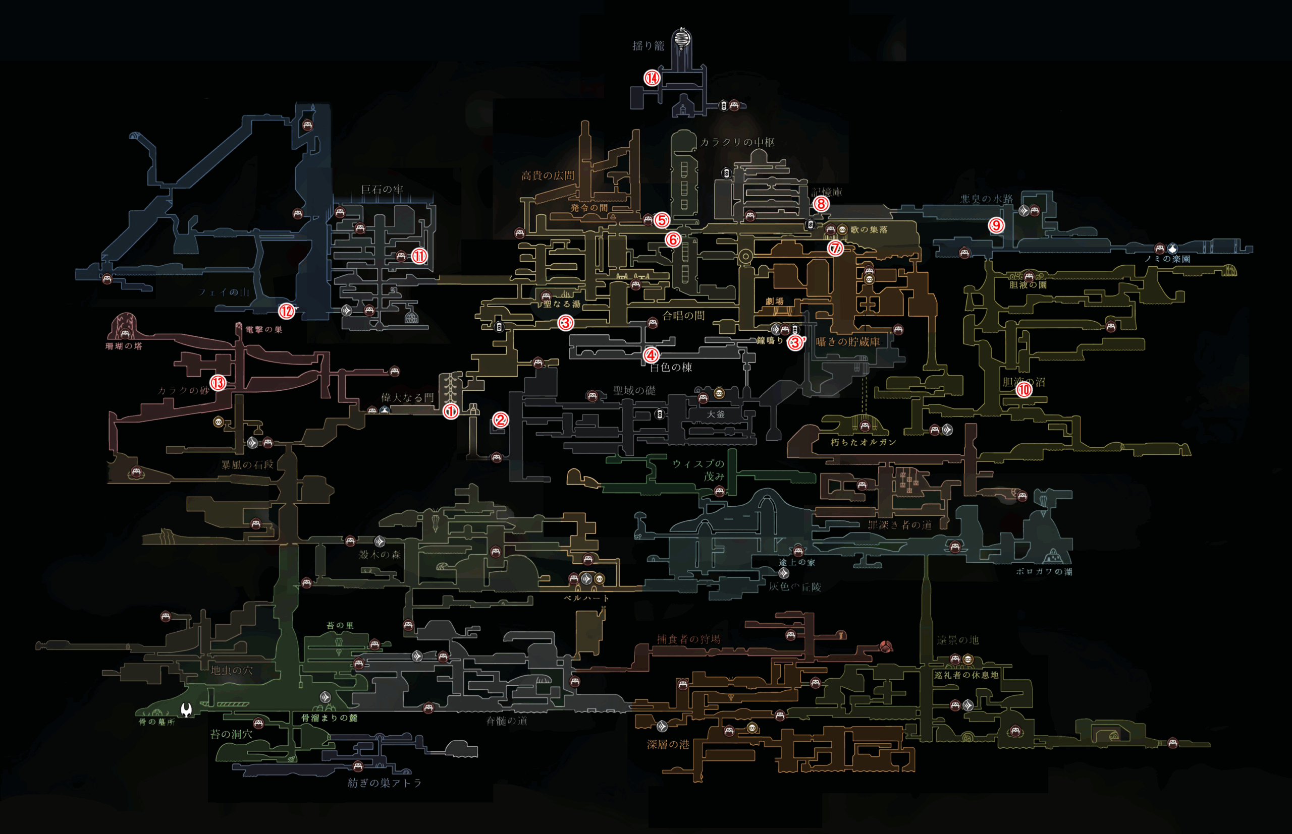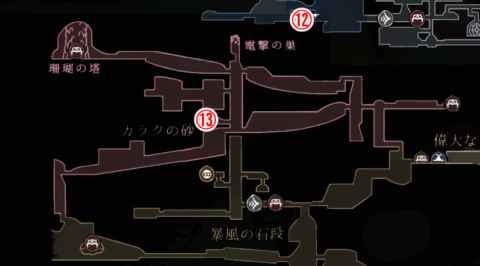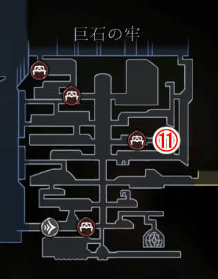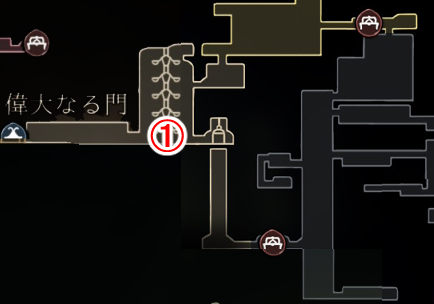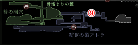 紡ぎの巣アトラの地図は、入口から右に突き当りまで歩き、フロア上部にある出っ張り2つを攻撃することで⑨の位置にある光るルーンから地図を回収することができます。