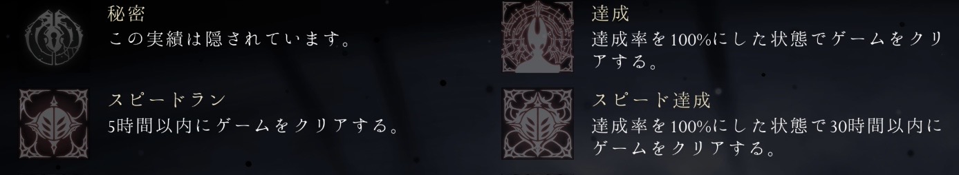 『シルクソング』には、「5時間以内にゲームをクリアする」や「達成率100%の状態で30時間以内にクリアする」といった、時間制限のあるスピードラン系の実績・トロフィーが存在します。これらは、プレイ時間が規定の時間を超えてしまうと、そのセーブデータでは達成不可能となってしまいます。