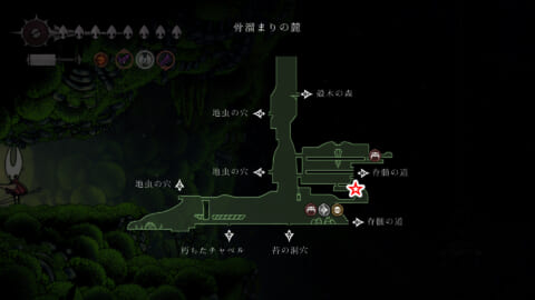 苔の里から骨溜まりの麓をぐるっと回り込むように移動し、壁を破壊した先に進むことで発見できます。