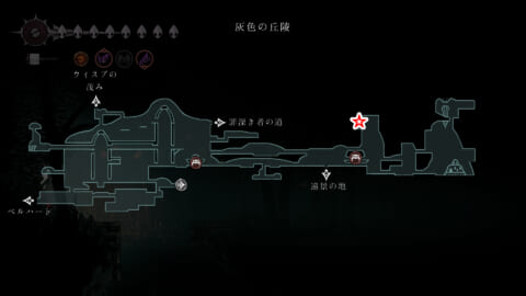 灰色の丘陵の「罪深き者の道」への通路の左側にあります。この場所へ到達するには「接着の爪」が必要となります。