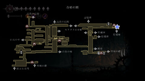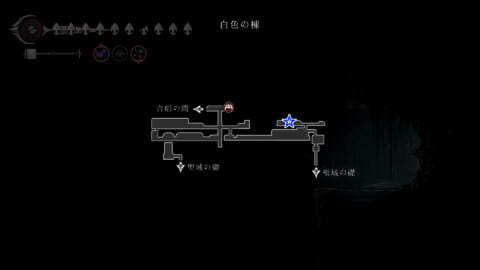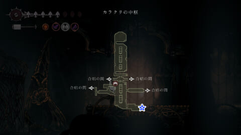 記憶庫にあるトゲのアスレチックの先に糸巻の破片があります。このエリアへは「二段ジャンプ」が必要で、初回訪問時は歌の集落とカラクリの中枢の間の天井を二段ジャンプで上がったところからアクセスできます。