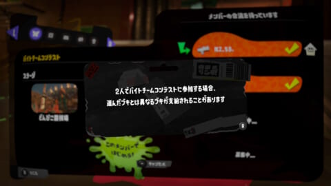 ※1人で参加した場合に使用するブキは、その回のバイトチームコンテストで使用できるブキのうち、ほかのプレイヤーと重複しないものが自動的に選ばれます。