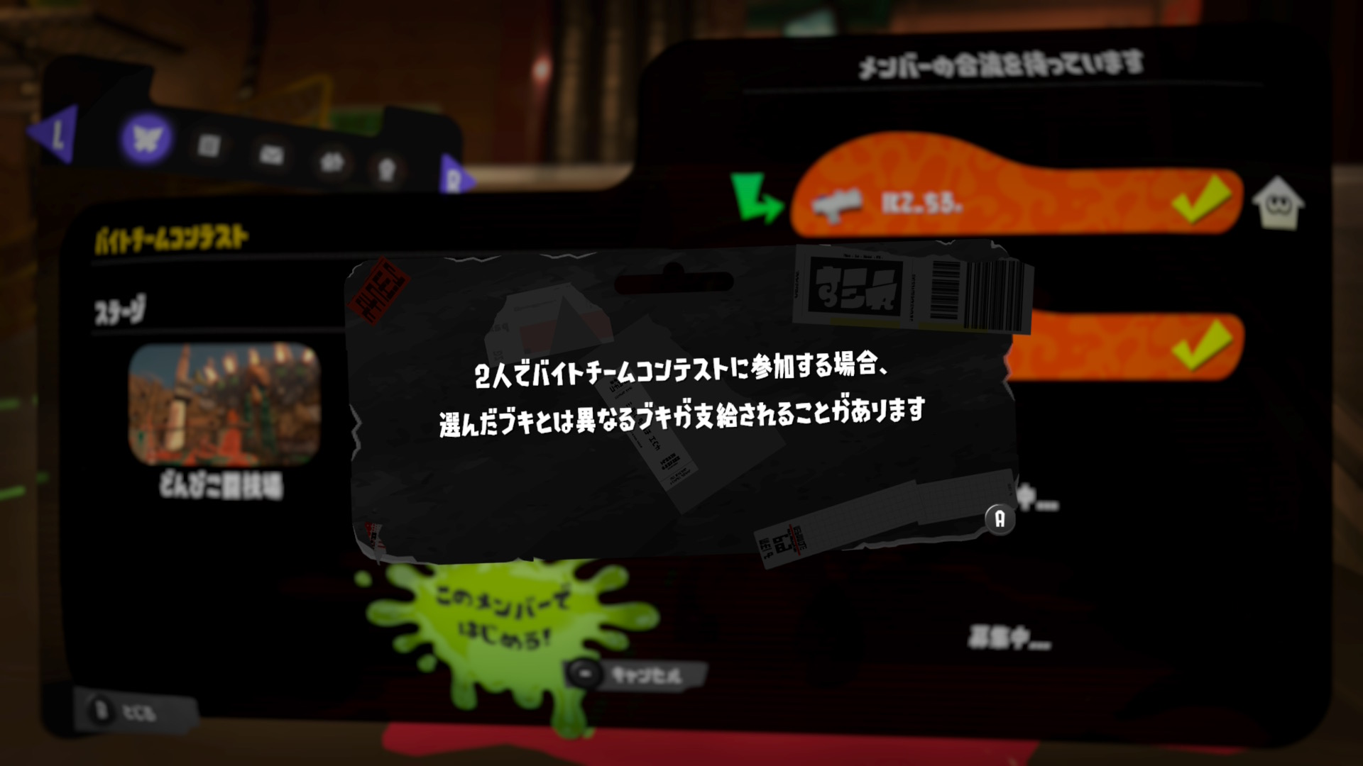 ブキは現場へ向かう前に指定された4つの中から他のメンバーと重ならないように選びましょう。他のプレイヤーと重複するブキを選択していると「準備OK」を押すことができません。