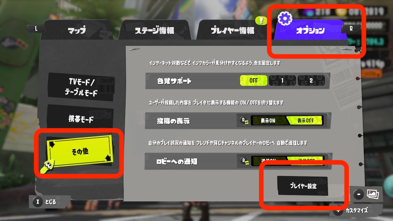 プレイアブルキャラクターとしてイカではなくタコを使いたい場合、Xボタンを押すと開くメニュー画面でいつでも変更することができます。
