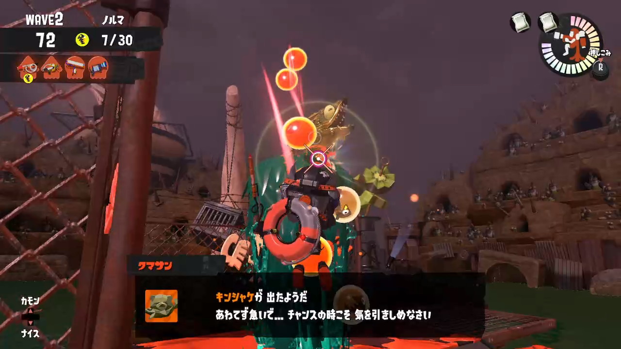 キンシャケが出たら金イクラを拾うのはやめて、どんな武器でもキンシャケを攻撃しにいく意識が重要になります。