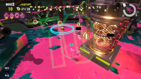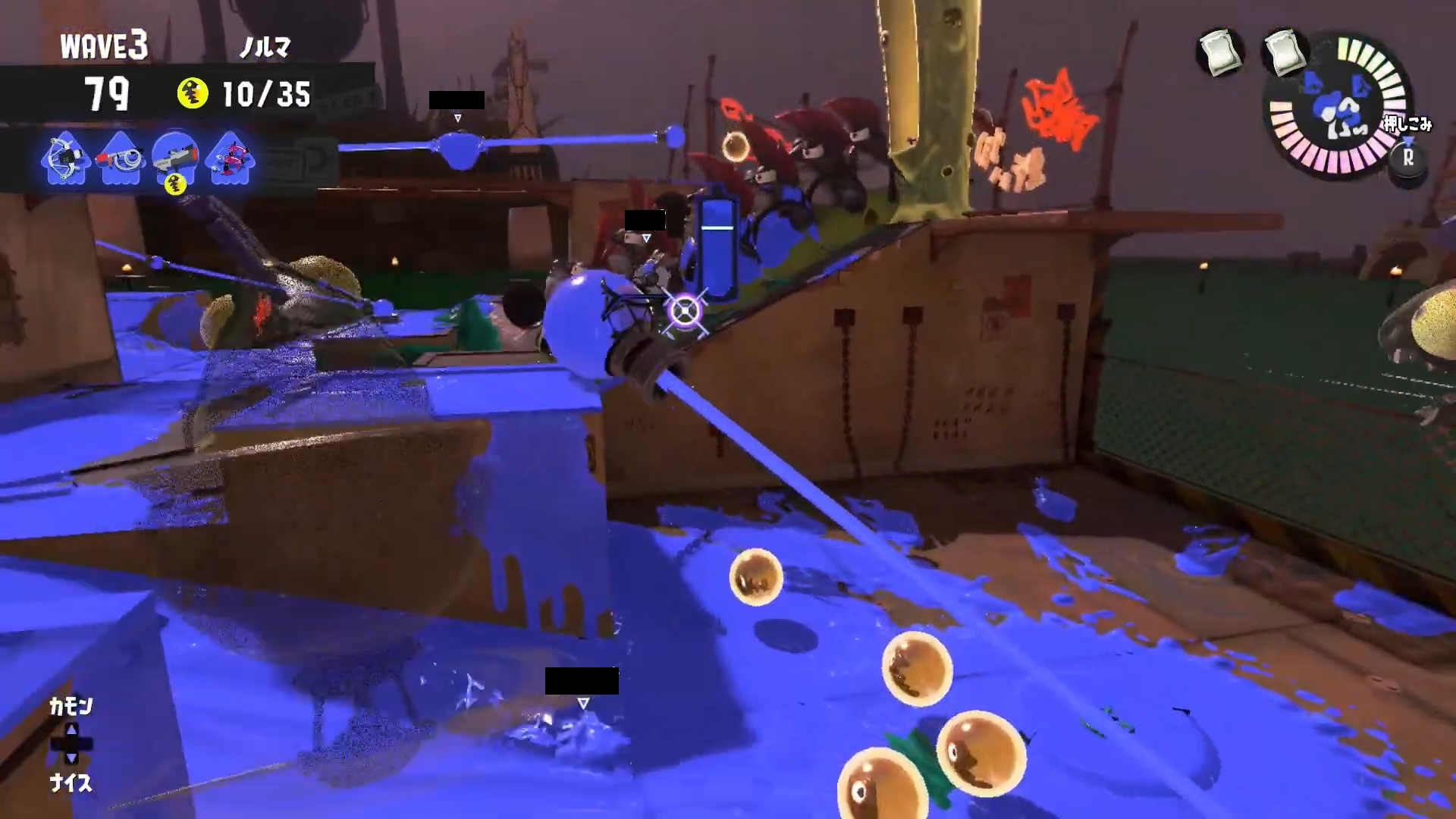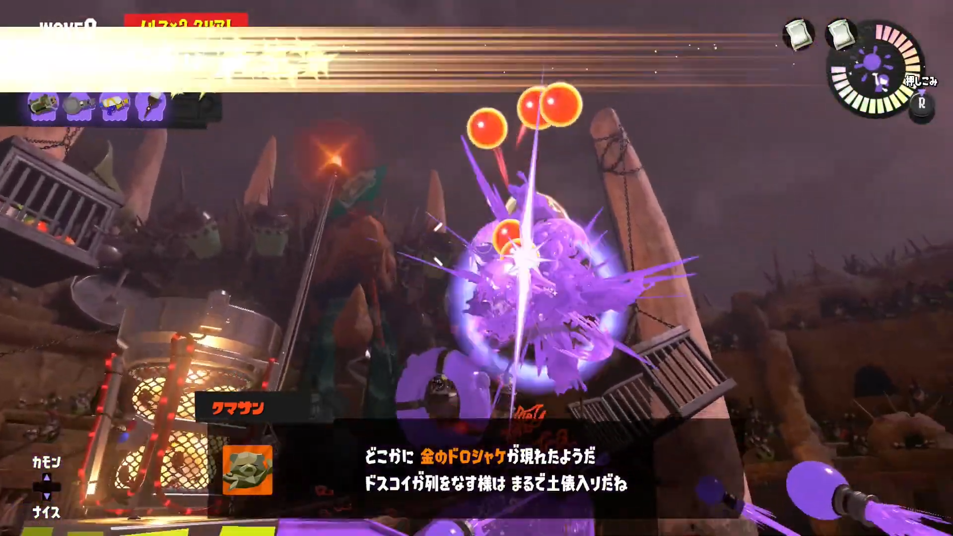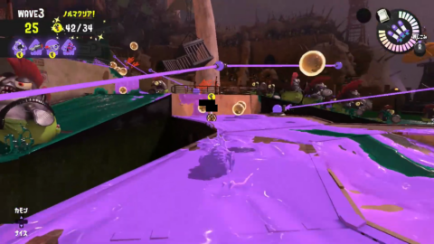 真右に沸くドロシャケは金網上から倒そうとするとインク切れを起こしやすいため、レールを使ってインク回復するかスペシャルを使って倒すことで雑魚シャケが溢れる前に倒しきることができます。