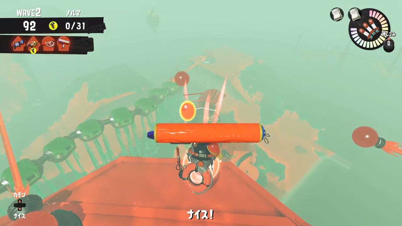他のステージでもいえる事ですが、特にどんぴこ闘技場満潮のキンシャケ探しは水に潜る時間も長くなりがちで倒しきれないことが多いです。