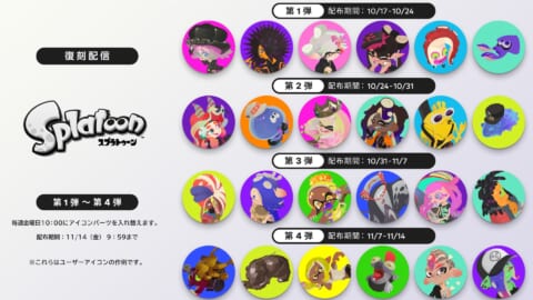 11/14(金)9:59まで、「Nintendo Switch Online」加入者が交換できるプラチナポイントギフトに「スプラトゥーン」シリーズのさまざまなキャラクターのアイコンパーツが再登場しています。
