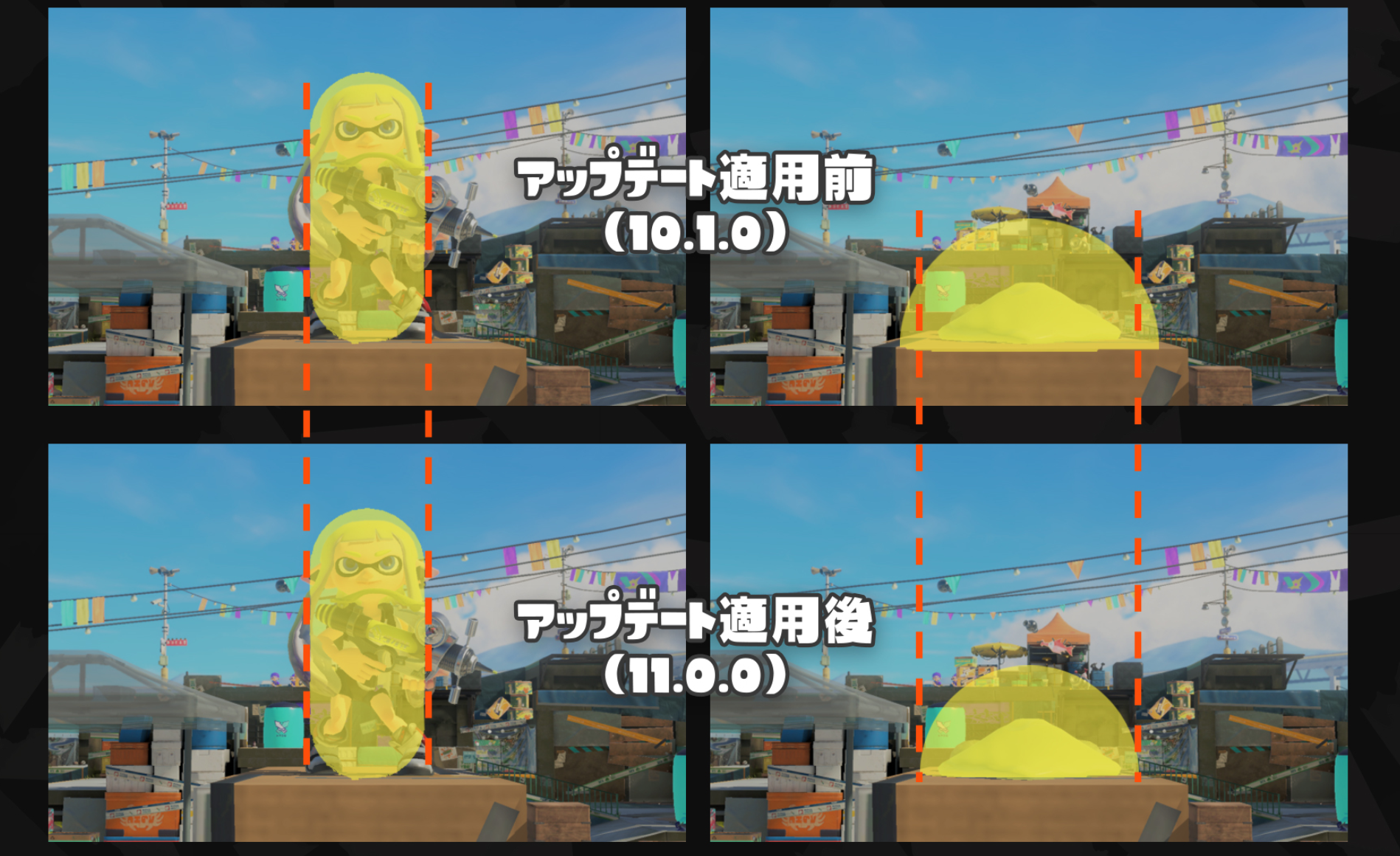 Ver.11.0.0以降のバトル中、イカ状態のプレイヤーの当たり判定がこれまでより小さくなり、相手の攻撃に当たりにくくなります。