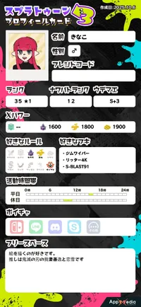 スプラトゥーン3メンバー募集中! 現在メンバー18人間! 24人で締め切ります! 2年間続いてます! 現在🚺5名🚹13メインで活動してます! XP関係なくどなたでも入れます!オープンやプラベしてます!良ければどうですか?みんな身内のように会話してます!最初仲良くなるまで大変な方も安心ください!慣れるまで僕がカバー致します! 子供から大人20代までの方がいます! 条件⬇️ enjoyの方! 通話可能な方! 恋愛禁止! 浮上率は特になしです!