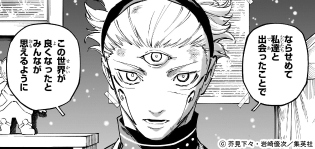 つまり、日本人とシムリア人から「可能な限り呪力を無く」し、それによってたまに出現する呪霊は長寿になってしまった虎杖が対策しつつ、呪霊も「調和」してルメル族が呪霊とカリヤンを混同する原因を取り除くことになります。