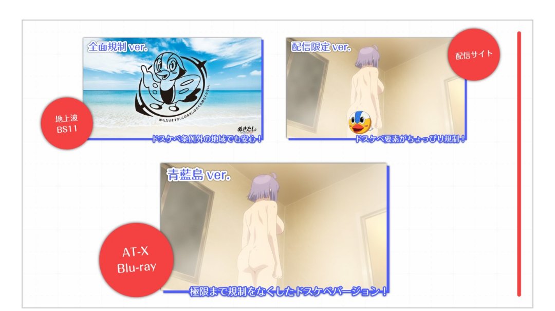 無修正版である「青藍島ver.」は、公式ニュースで「AT-X」とBlu-ray BOX向けとなっています。配信サービスで見られる「配信限定ver.」と、AT-X / Blu-ray BOXの「青藍島ver.」は分けて考える必要があります。