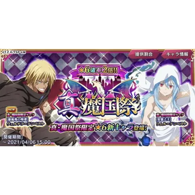 新登場限定キャラの★6[魔王の威厳]カリオン、★6[魔王の余裕]フレイが入っているスカウト。無償、有償嵐魔石共に使用可能。有償石で「10回引く」を3回引くことで限定★6新キャラのどちらが確定で貰える。初回有償石での「10回引く」が半額で引ける。