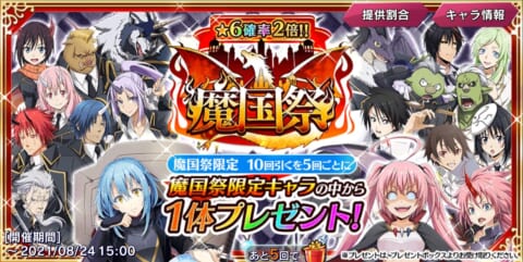 2.5周年で登場した限定キャラの★6[神託の降臨]リムル=テンペスト、★6[破壊の降臨]ミリム・ナーヴァ、★6[幻魔の降臨]ディアブロが覚醒して再登場したほか、2周年で登場した真・魔国祭キャラ3体が入っているスカウト。無償・有償嵐魔石共に使用可能。★6キャラは限定キャラのみで構成されている。