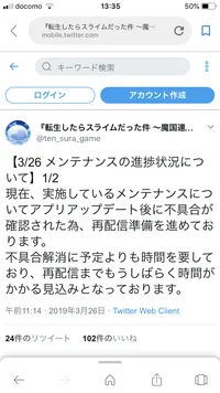 昨日の転スラアニメ最終回で、スラテンサービス終了のお知らせはなかったのかな? 探してもメンテ延長の記事しかない。ゲームゲートって会社が、アニメ最終回でサービス終了のお知らせを流したアプリにかかわってるって聞いて、覚悟してたのだが。