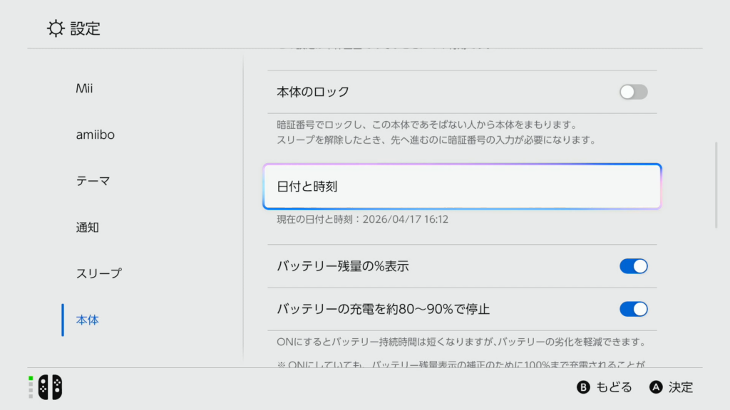 画面下部へスクロールして「本体」を選び、その中にある「日付と時間」を選択します。