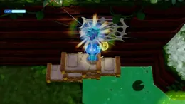 開始地点から少し進んだ先にある、横向きになった足場のクモの巣の中にトリィの仲間がいます。クモの巣を燃やしたあと、階段を作って助けましょう。
