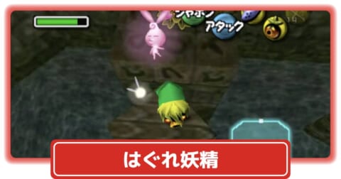 デクナッツの呪いを解いたあと、クロックタウン北にある大妖精の泉を訪れると「大妖精のお面」をもらうことができます。クロックタウンのはぐれ妖精は、昼間は洗濯場、夜間は東のエリアにいます。
