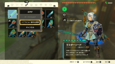 素材を消したい場合はポーチ画面でマスターソードを選択し、『スクラビルド素材を削除』を選択しましょう。