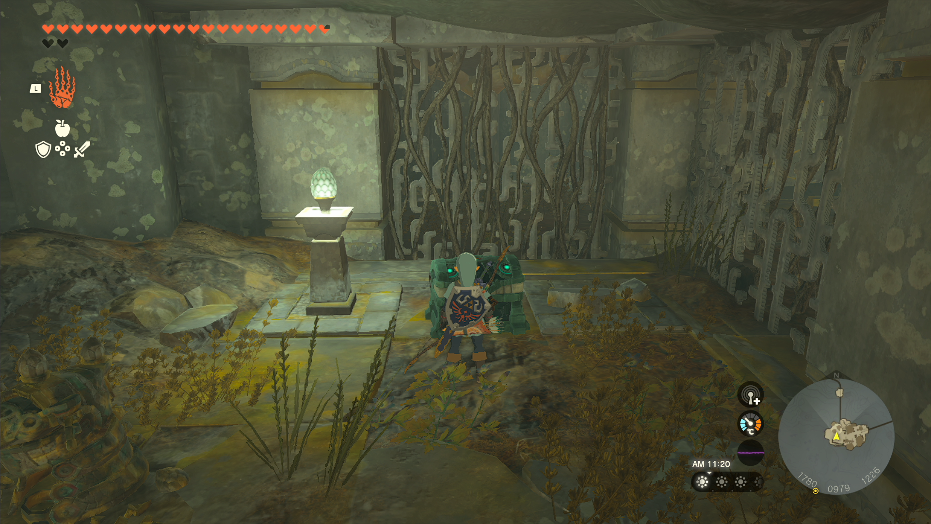 【行き方】 始まりの空島 「目覚めの間」(ワープポイント)からトーレルーフで天井を抜ける。できるだけ高い場所から南西にパラセール+チューリで飛ぶ。 【ギミック】 ブロックゴーレム の身体に付いている |