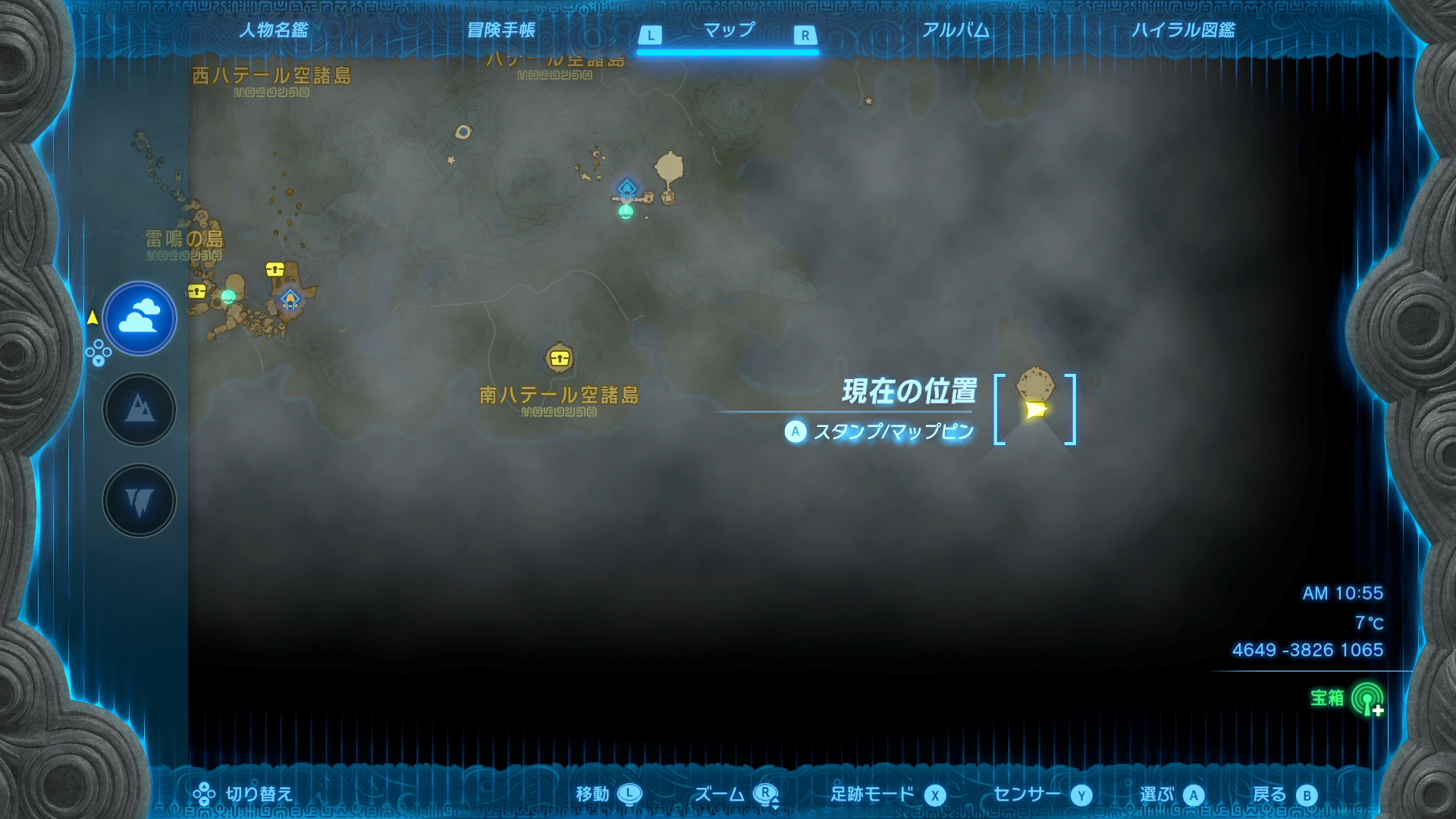 【行き方】 カルーガ峠 鳥望台 から飛び上がり南東へ。南ヘブラ空諸島の南の島に上陸する。正方形の板にフックと扇風機を付け、レールに引っ掛けて北の島へ。 【ギミック】謎解き・戦闘なし |