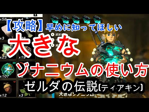 ゼルダの伝説 ティアーズオブザキングダム(ティアキン/TOTK)に登場するアイテム「大きなゾナニウム」の効果・能力、入手方法、使い道などを紹介しています。