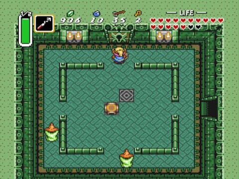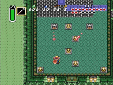 このフロアでは燭台に火を灯すと上の扉が開きますが、床のタイルがリンクを目掛けて飛んできます。 入ってきた場所から動かずにいると安全なため、床のタイルがすべて飛んできたら燭台に火を灯しましょう。