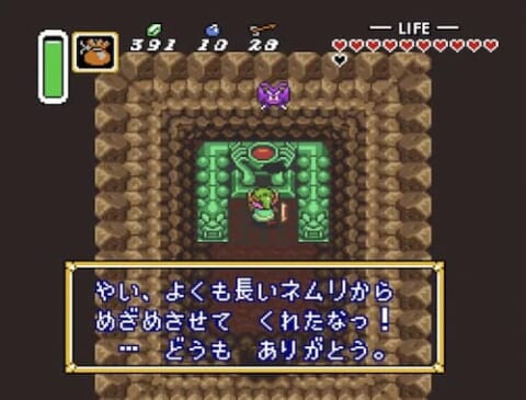 キノコを入手したあとは、北東にある魔法屋に向かいます。魔法屋についたらキノコを装備してYボタンでおばあさんに渡しましょう。キノコを渡したら画面移動(魔法屋の中以外)して魔法屋に入ります。