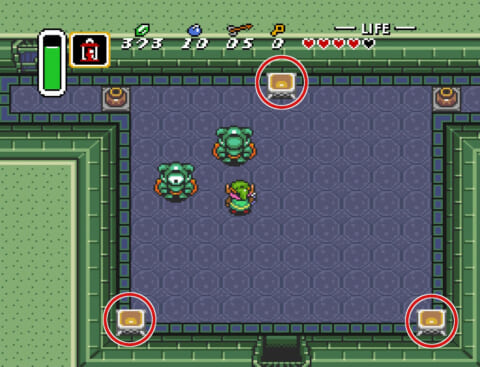緑のアイゴールを倒した後は赤丸地点の壺を持ち上げてスイッチを押します。 スイッチを押すと、宝箱が出現。宝箱から「大きなカギ」を入手。 |