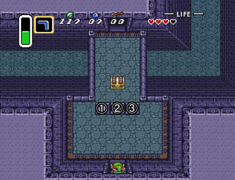 宝箱の取り方 ・①を下から上に押す ・③を下から上に押す ・②を右から左に押す 通路の先への進み方 ・②を下から上に押す ・①か③を左右へ押す |