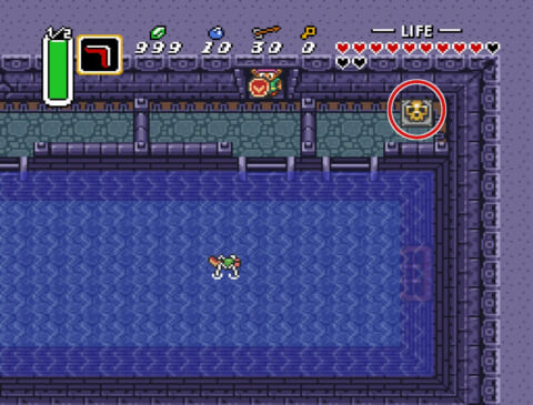 ⑯→⑰→⑱フロアと進みます。 ⑱フロアでは、流れる水の中、右側にあるドクロを持ち上げて「小さなカギ」を入手。 |