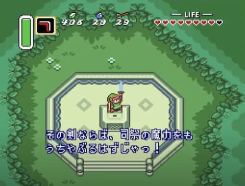 マスターソードはストーリー上、必要になるものです。ダンジョンをクリアして3つのペンダント(勇気・知恵・力)を手に入れたら、迷いの森へ行きましょう。森の奥にはマスターソードがあり、引き抜くと自動で剣がレベルアップします。