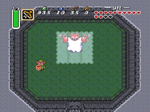 簡単に倒せるポイントとして、ボス前に剣をLv.3に強化しておく、そして光の世界で「マジックマント」を入手していると楽に倒せます。 ちなみに、頭が放ってくる火の玉は盾Lv.2だと防ぐことができます。 |